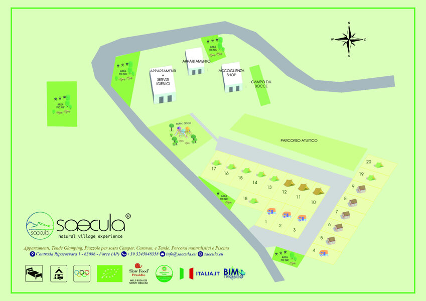 Diverse soluzioni di soggiorno esperienziali: Appartamenti, Glamping-Tende Lodges / Yurta / Tepee, Piazzole per sosta Camper/Caravan/Tende.